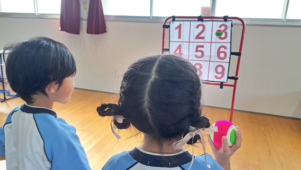ストライクゾーンの狙った数字に向けてボールを投げる、小さなお子様向けのゲームです。