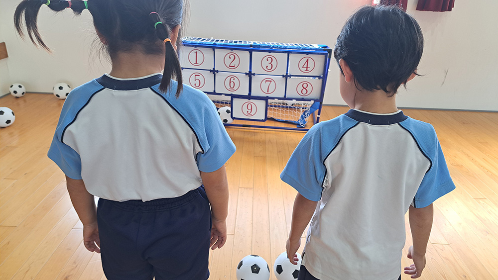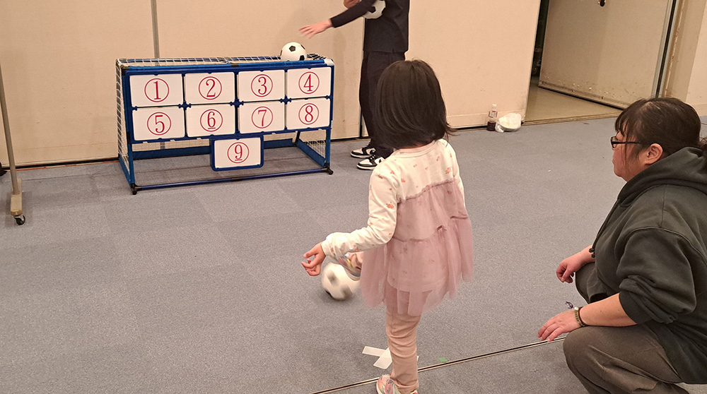 サッカーゴールの狙った数字に向けてボールを蹴る、小さなお子様向けのゲームです。