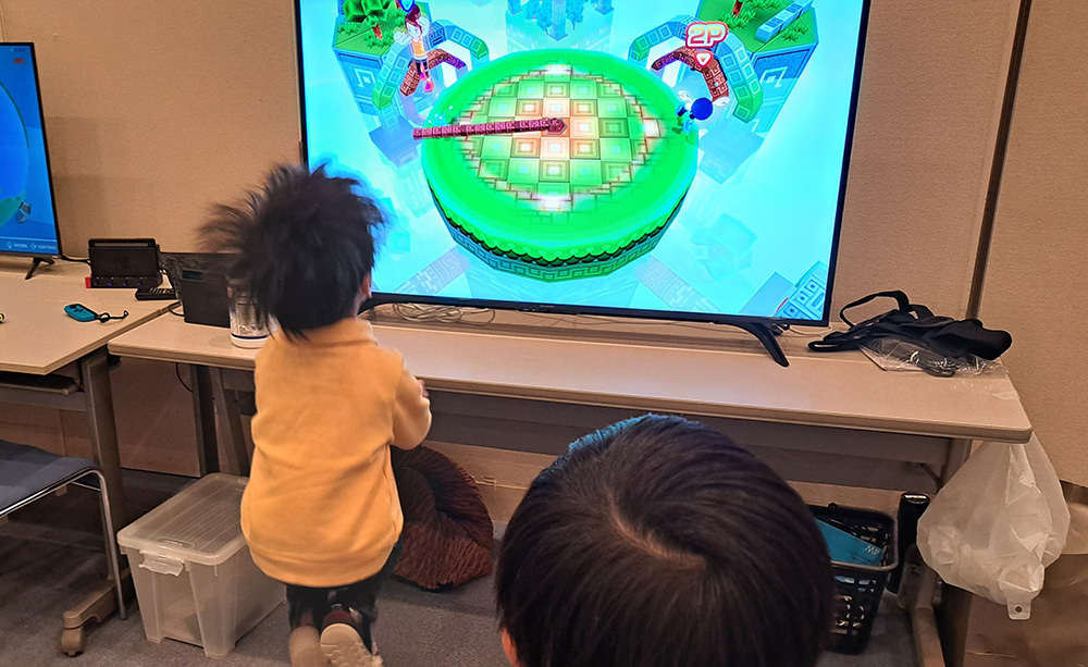 走ったり、跳んだり、体を動かしながら対戦または2人で協力し合うゲームです。